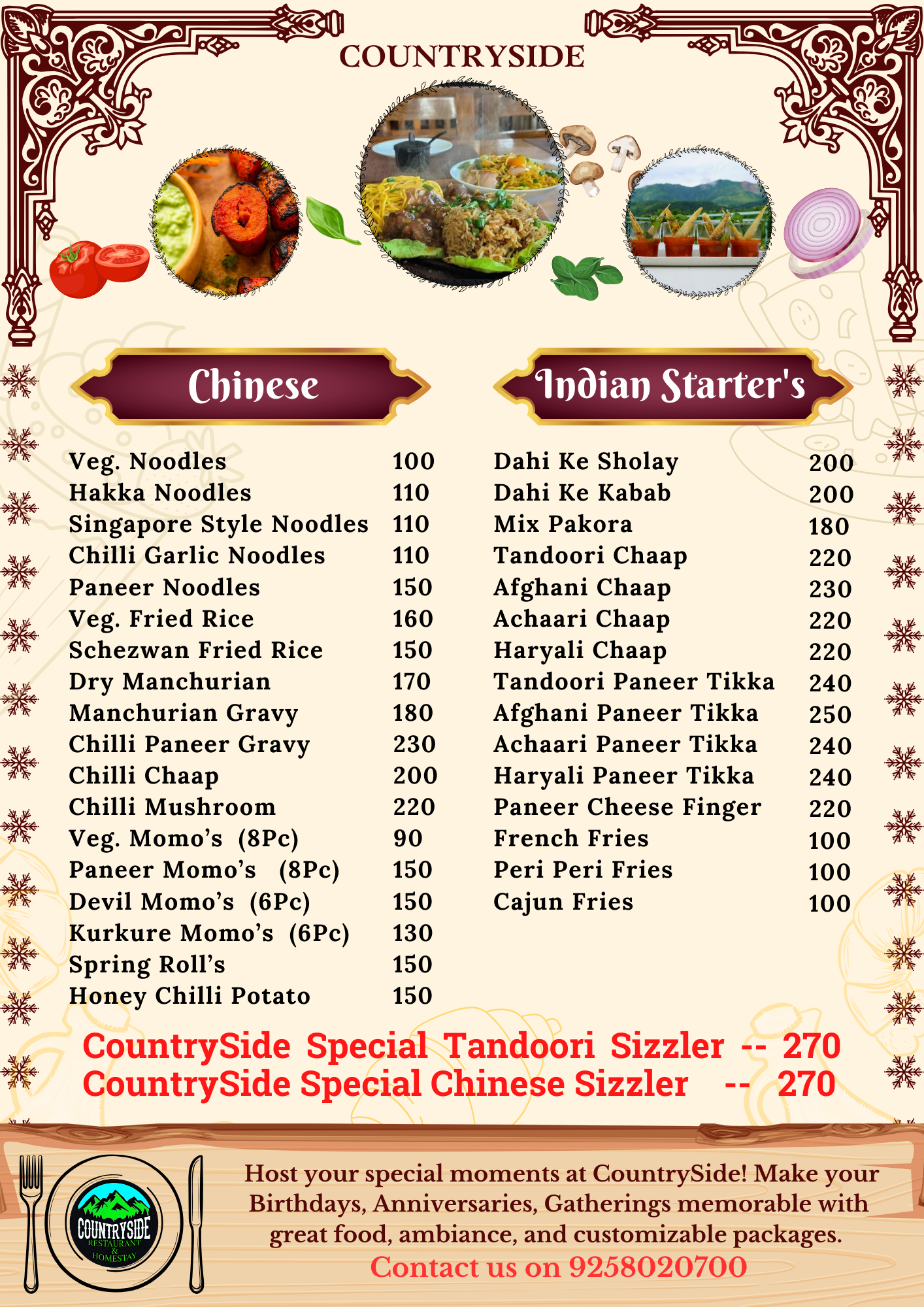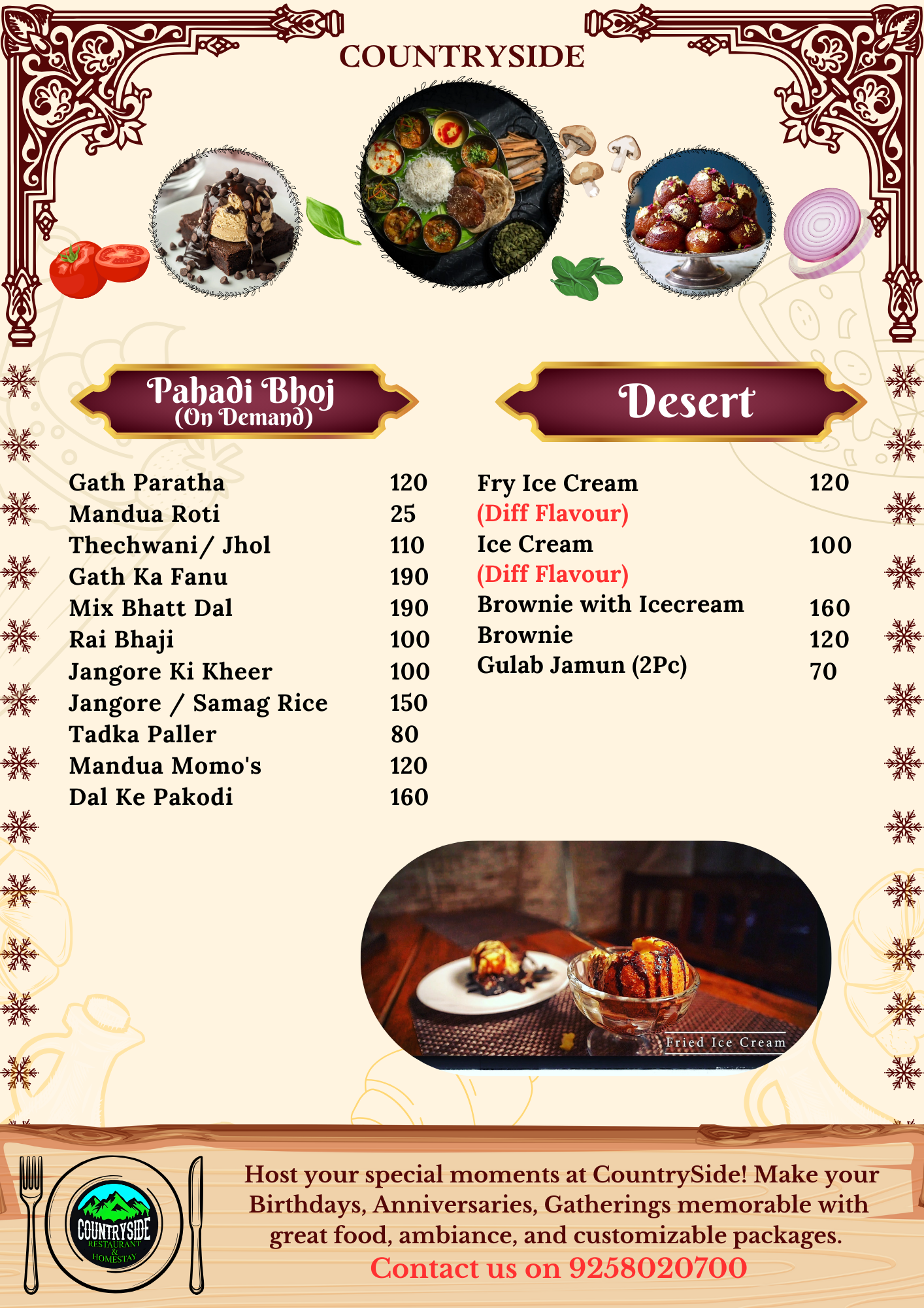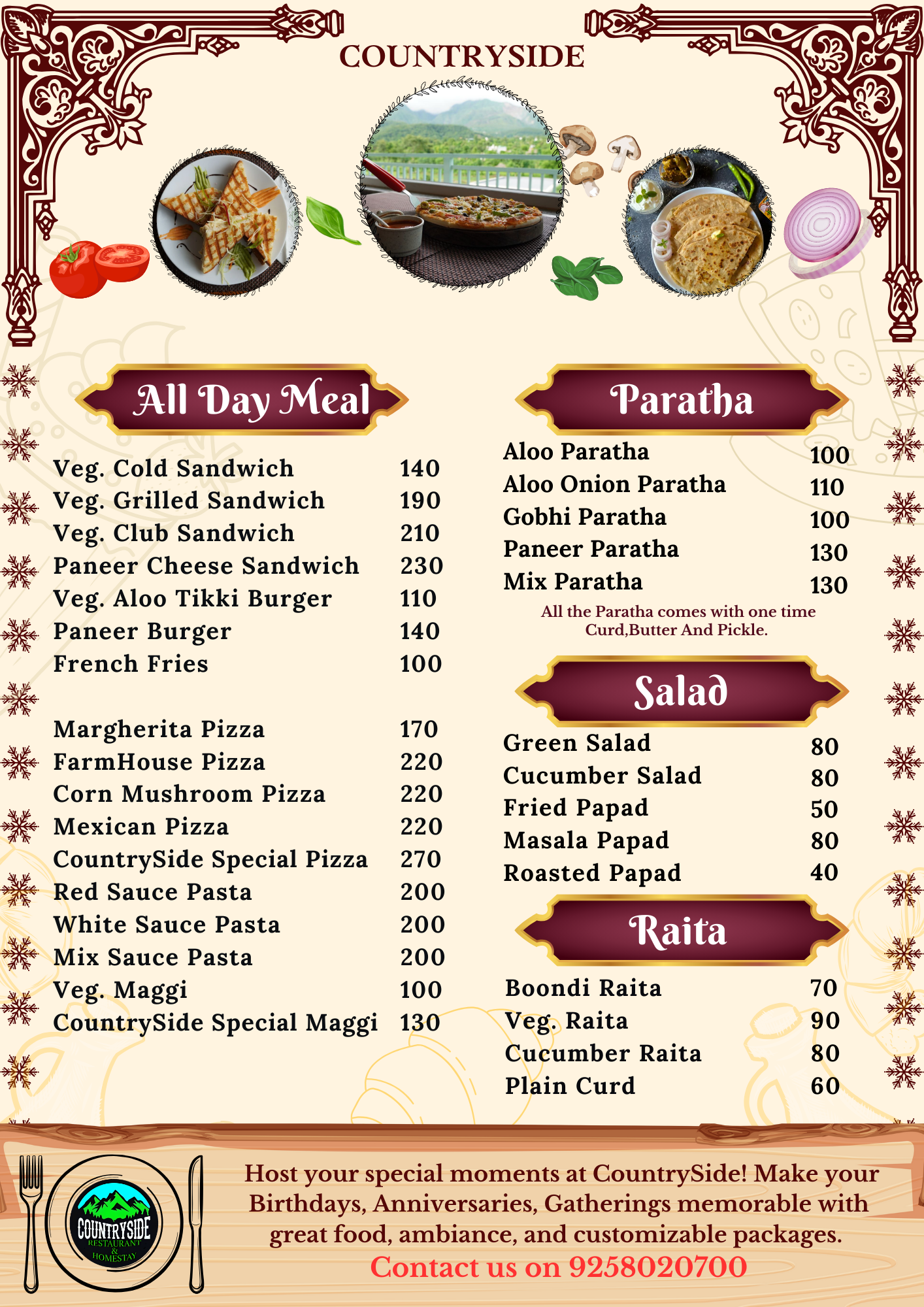 Welcome to Countryside, a unique blend of a veg restaurant and homestay located in the beautiful city of Dehradun, India. Our restaurant and homestay offer a breathtaking view of the mountains and countryside, making it the perfect escape from the hustle and bustle of city life. At Countryside, we pride ourselves on serving delicious, healthy and hearty meals prepared by our professional chef. Whether you're in the mood for a hearty breakfast, a light lunch, or a satisfying dinner, we have something for everyone. Our menu features a variety of dishes made with fresh, locally sourced ingredients, including traditional Indian dishes, international favorites, and vegetarian options. In addition to our restaurant, we also offer comfortable and cozy accommodations for travelers. Our homestay features five spacious rooms, each equipped with all the amenities you need for a comfortable stay, including air conditioning, television, and private bathrooms. Countryside is the perfect choice. We look forward to welcoming you to our beautiful homestay and restaurant.